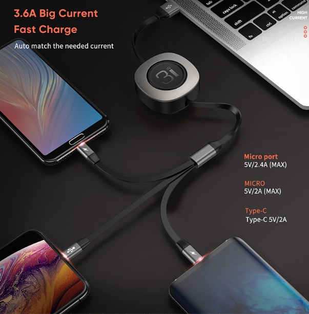 - Кабель Rock G3 Stretchable Cable 3 in 1 телескопический "рулетка" (RCB0738) 120 см.